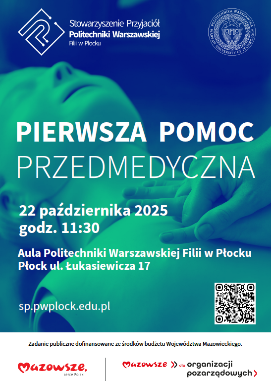 Serdecznie zapraszamy do udziału w wydarzeniu „Pierwsza Pomoc Przedmedyczna”, które odbędzie się 22 października 2025 r. o godz. 11:30 w Auli Gmachu Głównego Politechniki Warszawskiej Filii w Płocku (ul. Łukasiewicza 17).